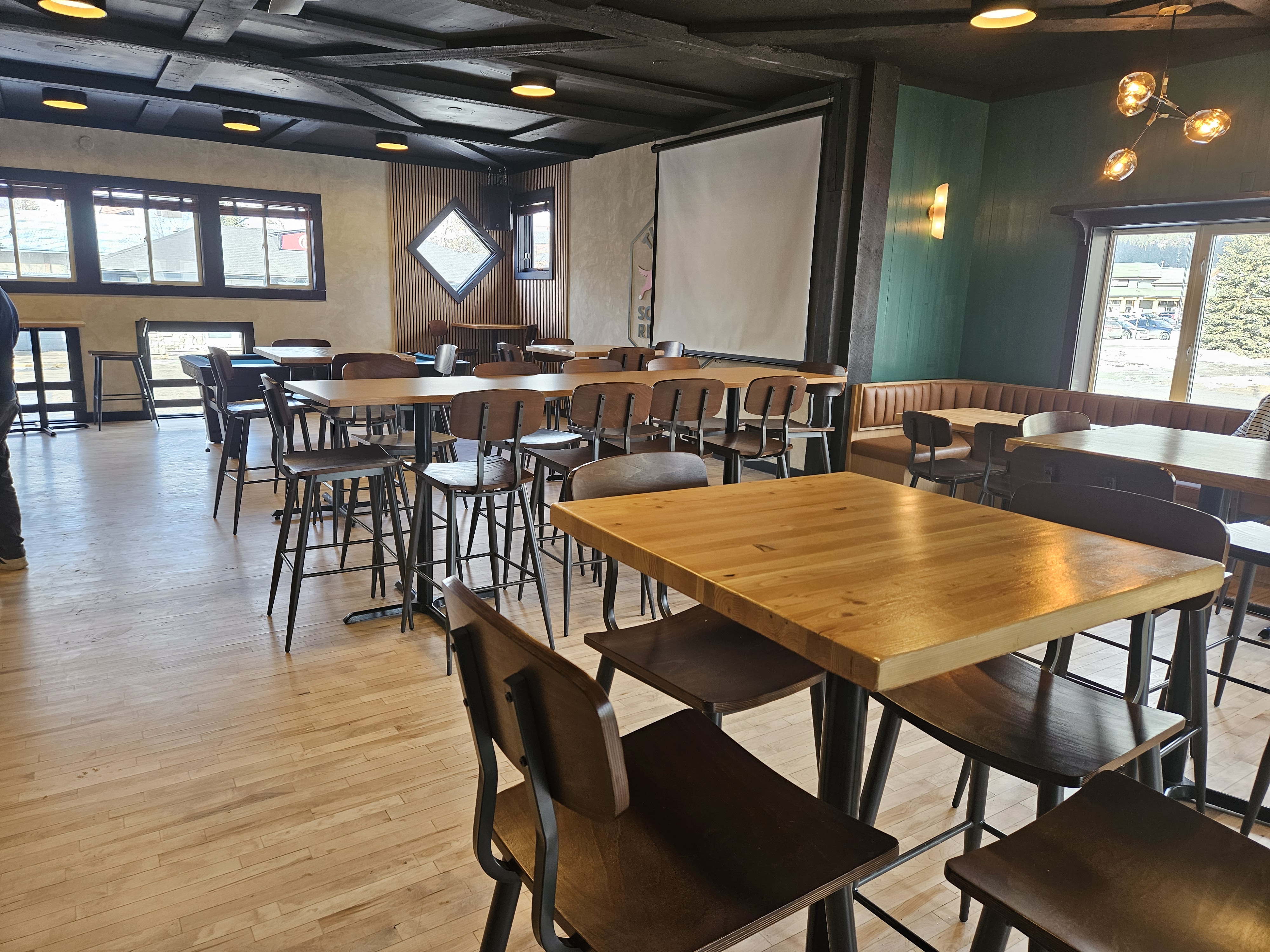 Our newly renovated Screaming Retriever taproom features mountain views, a Rundle Rock fireplace, a long bar, communal tables with mixed seating, and a dedicated pool table area. This relaxed, casual setting is perfect for everything from corporate parties to wedding gatherings.